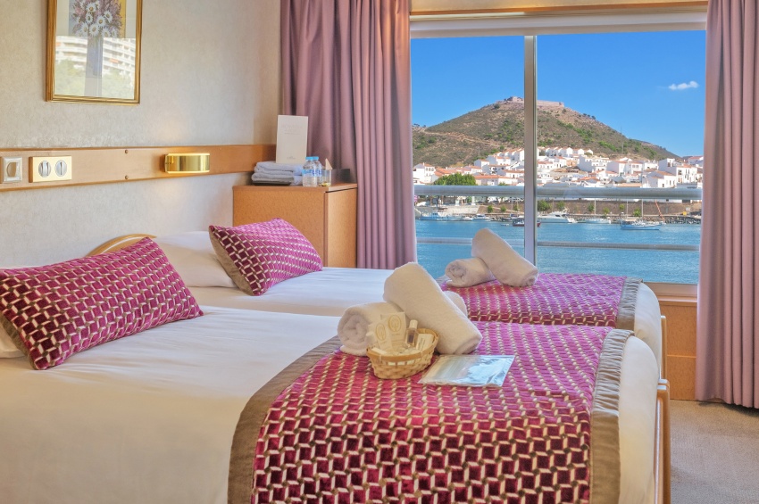 Camarote amplio y cómodo con cama grande separable, baño (lavabo, ducha y aseo privados, toallas incluidas), secador, televisión, caja fuerte y radio. Situado en el puente superior con balcón francés, ventanas panorámicas correderas, ofrece una vista panorámica del paisaje.Áreas comunes del barco