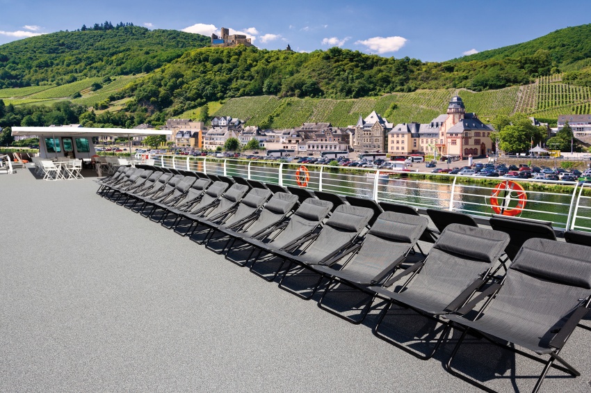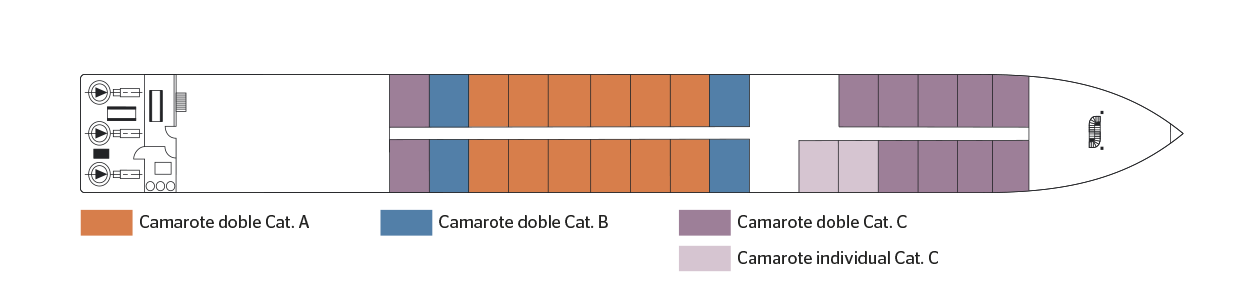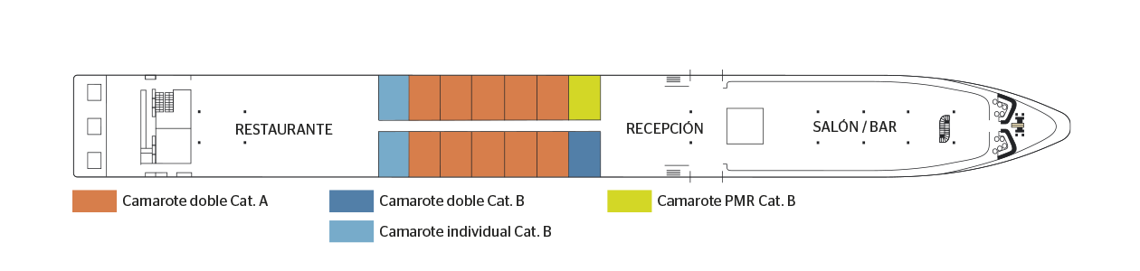 Camarote amplio y cómodo con balcón francés y ventanal corredero, cama individual, baño (lavabo, ducha y aseo privados, toallas incluidas), secador, televisión, caja fuerte y radio. Situado en el puente superior con balcón francés, ventanas panorámicas correderas, ofrece una vista panorámica del paisaje.Áreas comunes del barco