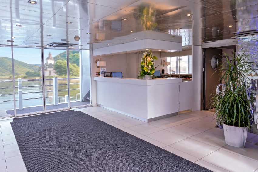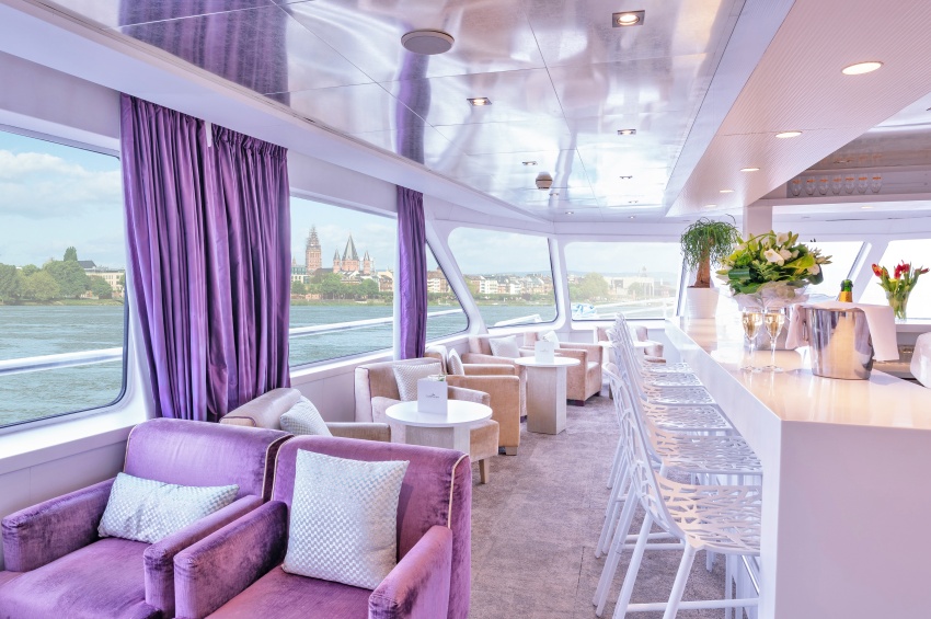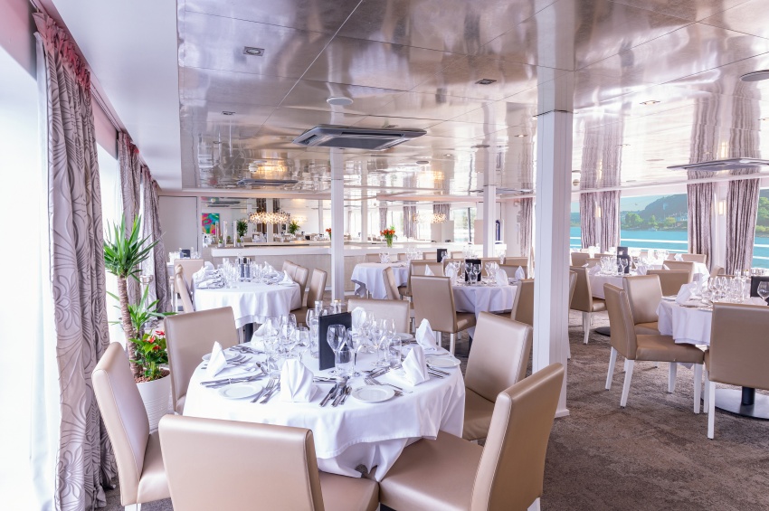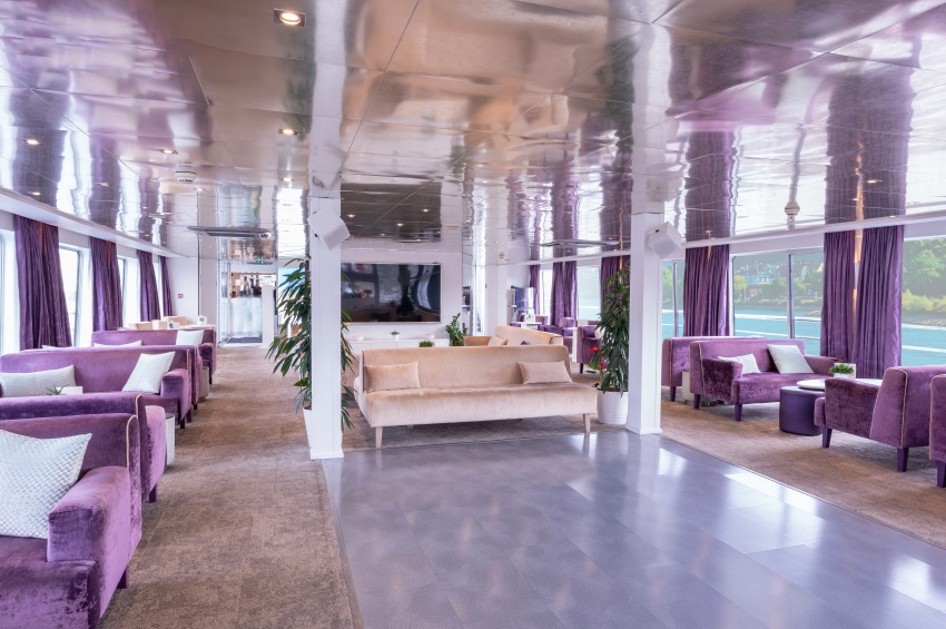 El interior, muy contemporáneo, sobrio y a la vez chispeante se realizó en tonos grises y arena, ligados con acordes malvas y lilas. Ubicado en el puente superior, el restaurante, donde se sirven todas las comidas durante el viaje, ofrece una cocina delicada en un entorno refinado, donde los grandes ventanales permiten disfrutar al máximo del panorama. En este mismo puente se sitúa también el salón / bar con pista de baile y bar central, mientras que en el puente sol, lugar ideal para relajarse y admirar paisajes, los pasajeros pueden disponer de confortable tumbonas, así como de una amplia zona de sombra.