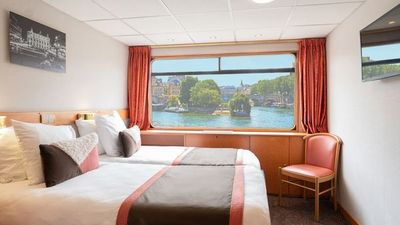 Camarote cómodo con cama grande separable, baño (lavabo, ducha y aseo privados, toallas incluidas), secador, televisión, caja fuerte y radio. Situado en el puente principal, ofrece una vista panorámica del paisaje.