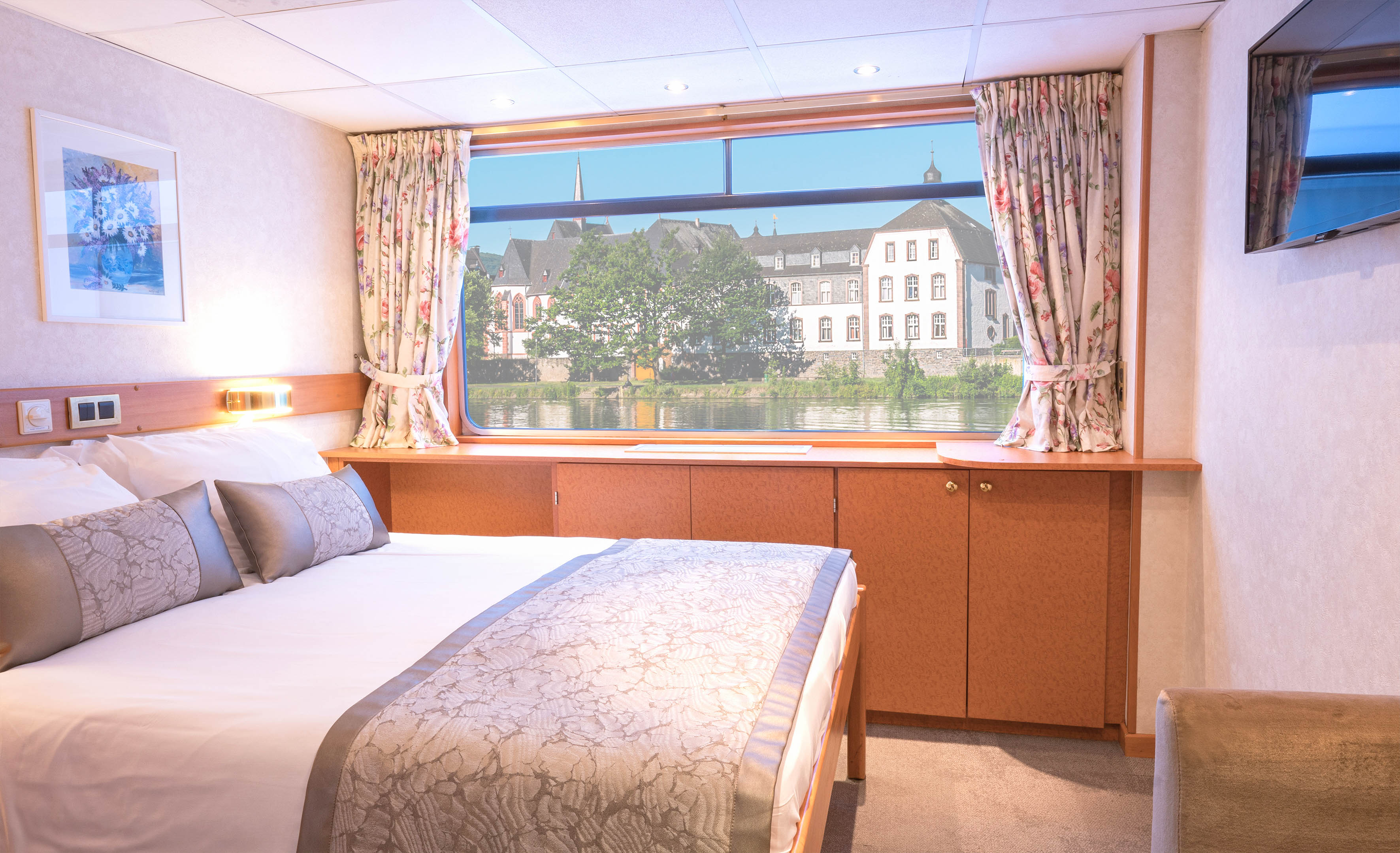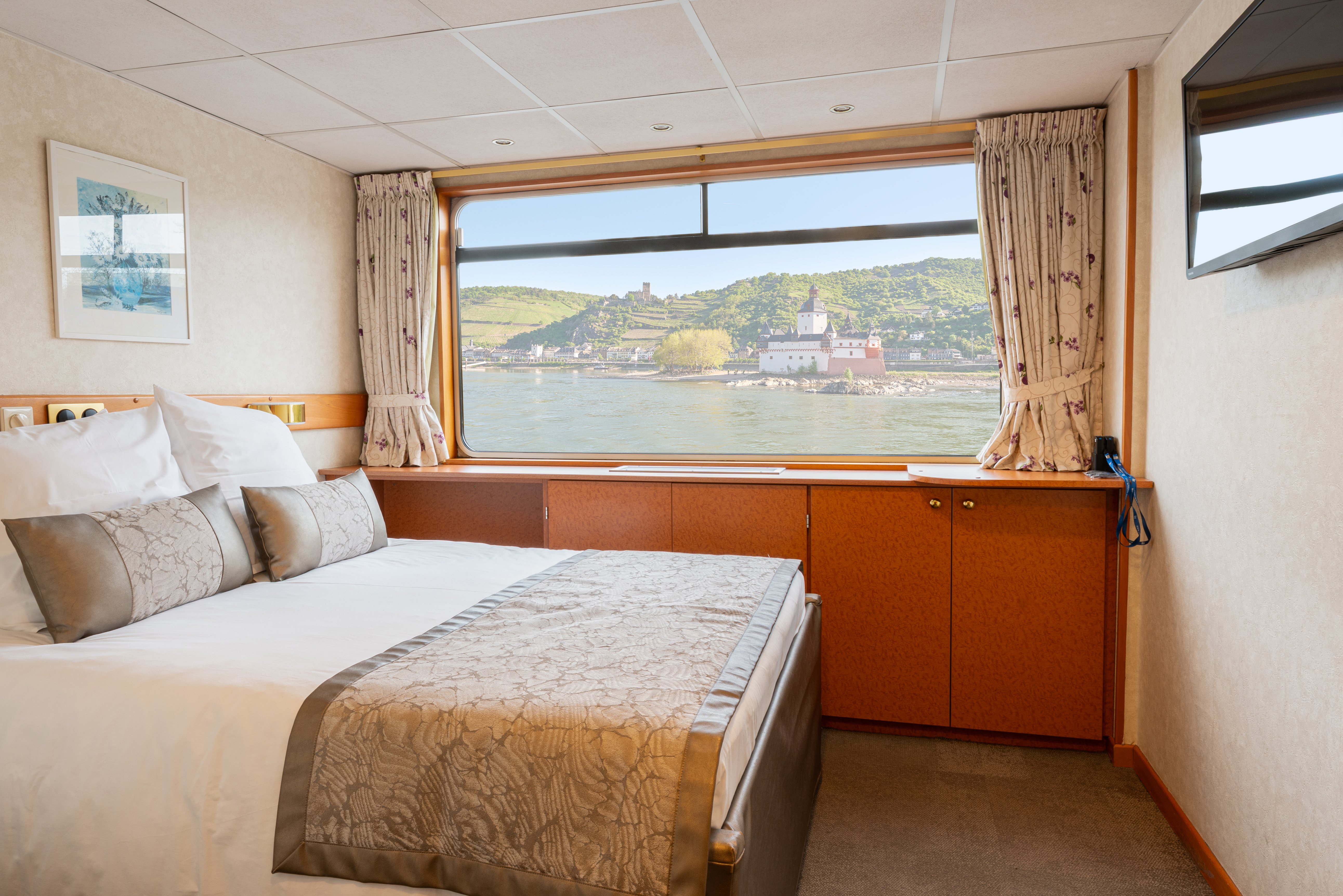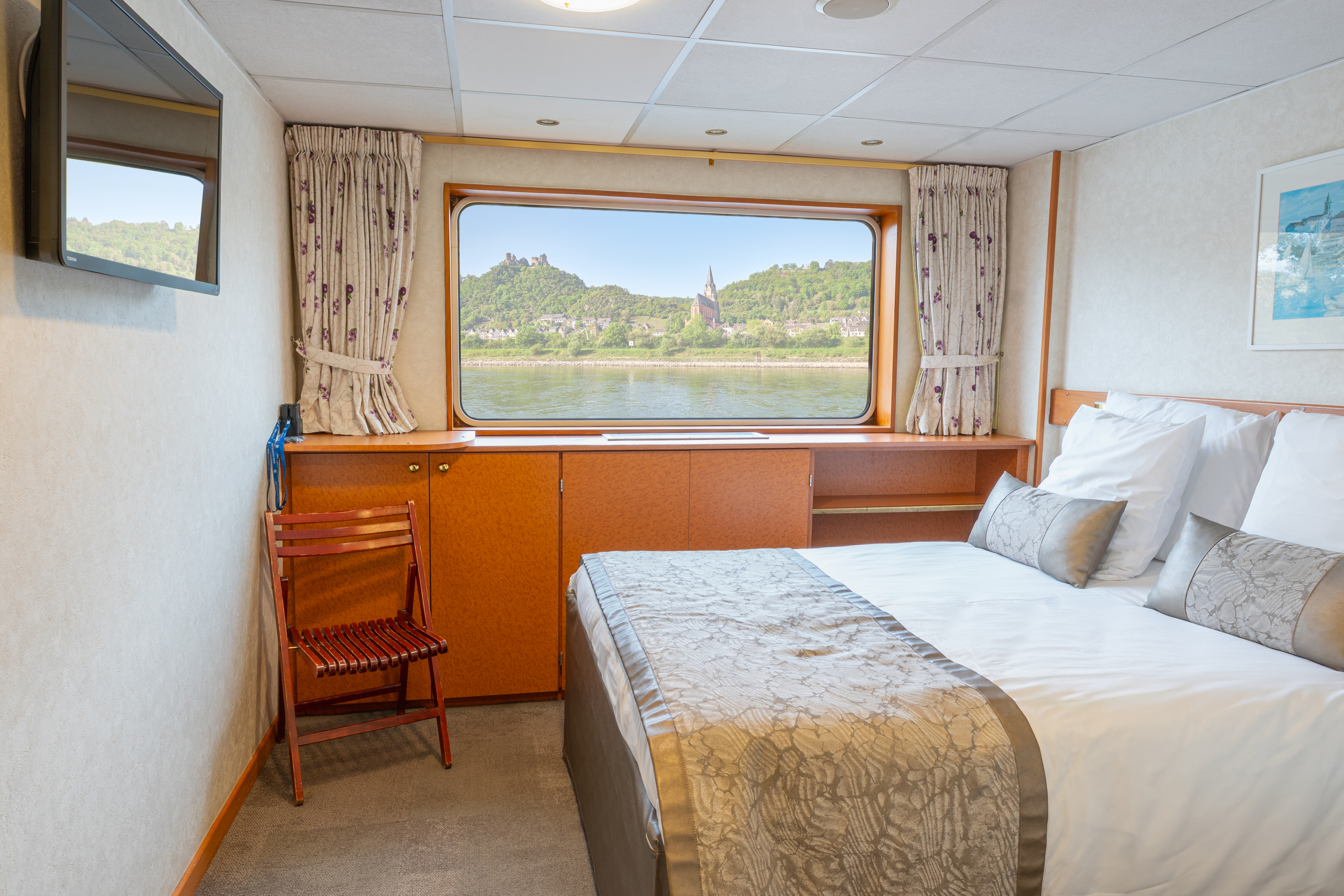 Camarote amplio y cómodo con cama grande separable, baño (lavabo, ducha y aseo privados, toallas incluidas), secador, televisión, caja fuerte y radio. Situado en el puente principal con ventanas alta, ofrece una vista panorámica del paisaje.