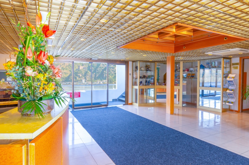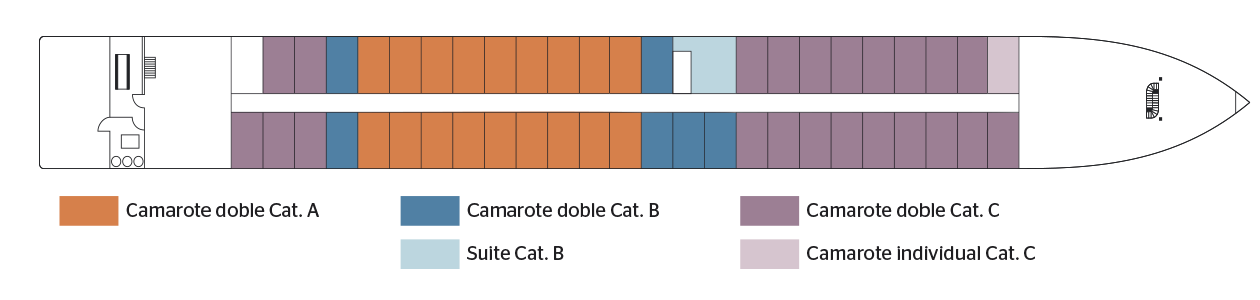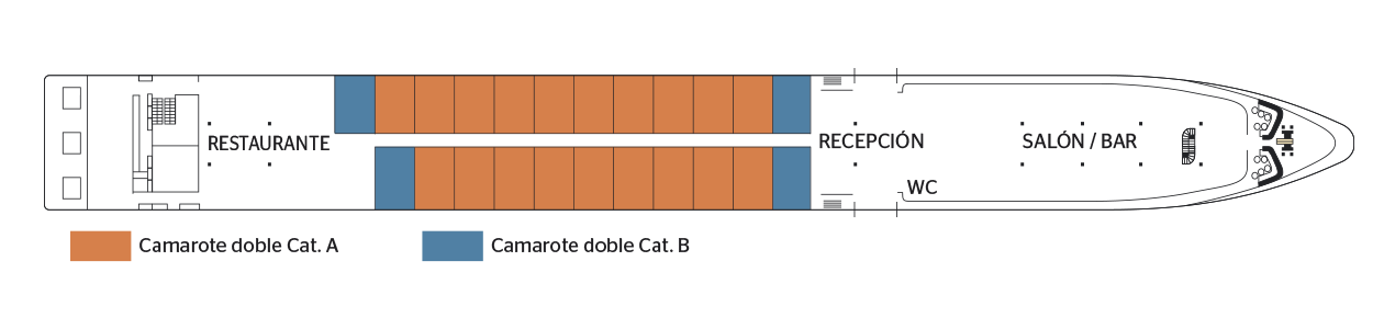 Camarote amplio y cómodo con cama grande separable, baño (lavabo, ducha y aseo privados, toallas incluidas), secador, televisión, caja fuerte y radio. Situado en el puente superior con ventanas altas correderas, ofrece una vista panorámica del paisaje.Áreas comunes del barco