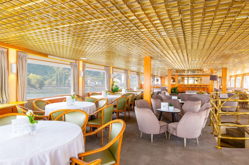 Ubicado en el puente superior, el restaurante, donde se sirven todas las comidas durante el viaje, ofrece una cocina delicada en un entorno refinado, donde los grandes ventanales permiten disfrutar al máximo del panorama. En este mismo puente se encuentra también el salón / bar con pista de baile, mientras que en el puente sol, lugar ideal para relajarse y admirar los paisajes, los pasajeros pueden disponer de confortables tumbonas, así como de una amplia zona de sombra.