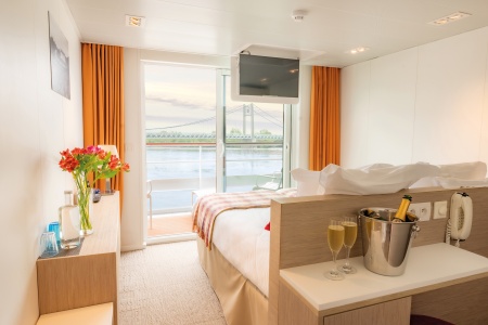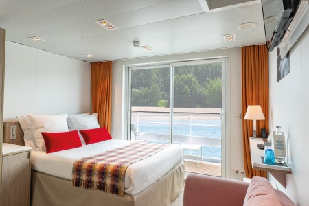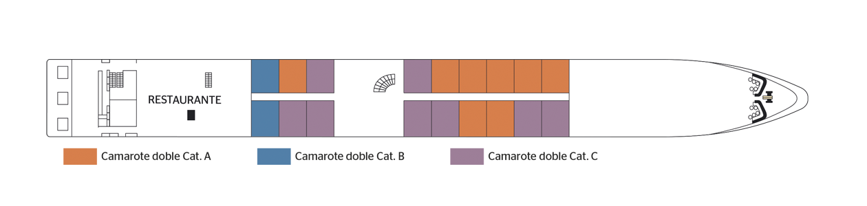 Camarote amplio y cómodo con balcón privado. Cuenta con una cama grande separable, baño (lavabo, ducha y aseo privados, toallas incluidas), secador, televisión, caja fuerte y radio. Situado en el puente superior con terraza amueblada, ventanas panorámicas correderas, ofrece una vista panorámica del paisaje.Áreas comunes del barco