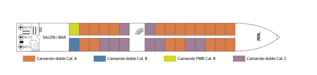 Camarote amplio y cómodo con cama grande separable, baño (lavabo, ducha y aseo privados, toallas incluidas), secador, televisión, caja fuerte y radio. Situado en el puente principal con ventanas altas, ofrece una vista panorámica del paisaje.PUENTE SUPERIOR