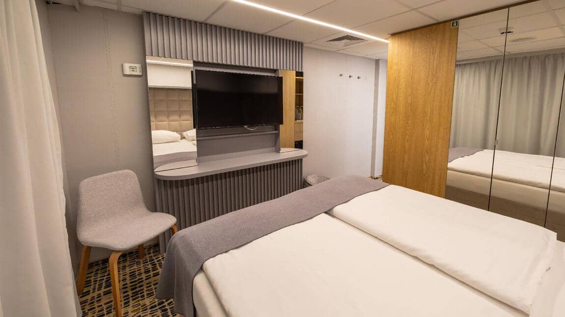 Camarote con balcón francés. Dispone de cama doble, TV por satélite, radio, aire acondicionado, teléfono interno y caja fuerte. Cuarto de baño con ducha y secador de pelo.