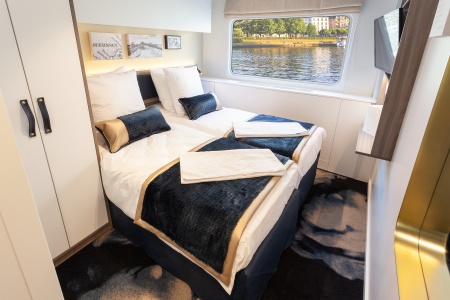Camarote cómodo con dos camas individuales separados, baño (lavabo, ducha y aseo privados, toallas incluidas), secador, televisión, caja fuerte y radio. Situado en el puente principal con grandes ventanas, ofrece una vista panorámica del paisaje.
