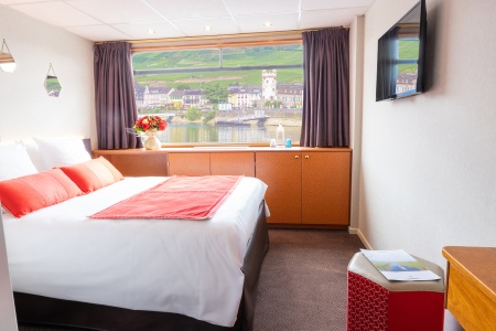 Camarote amplio y cómodo con cama grande, baño (lavabo, ducha y aseo privados, toallas incluidas), secador, televisión, caja fuerte y radio. Situado en el puente intermedio con ventana corredera con ventanas altas correderas, ofrece una vista panorámica del paisaje.