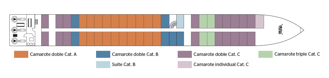 Camarote amplio y cómodo con capacidad para 3 personas (2 camas inferiores y 1 superior), baño (lavabo, ducha y aseo privados, toallas incluidas), secador, televisión, caja fuerte y radio. Situado en el puente principal con ventanas altas, ofrece una vista panorámica del paisaje.PUENTE SUPERIOR