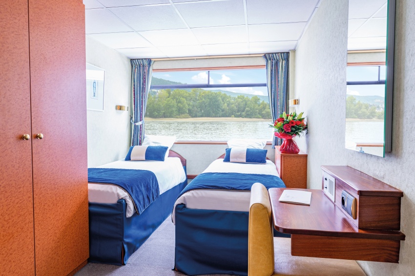 Suite amplia y cómoda con dos camas individuales, baño (lavabo, ducha y aseo privados, toallas incluidas), secador, televisión, caja fuerte y radio. Situada en el puente principal con ventanas altas, ofrece una vista panorámica del paisaje.PUENTE PRINCIPAL 2 CAMAS SEPARABLES CAT C