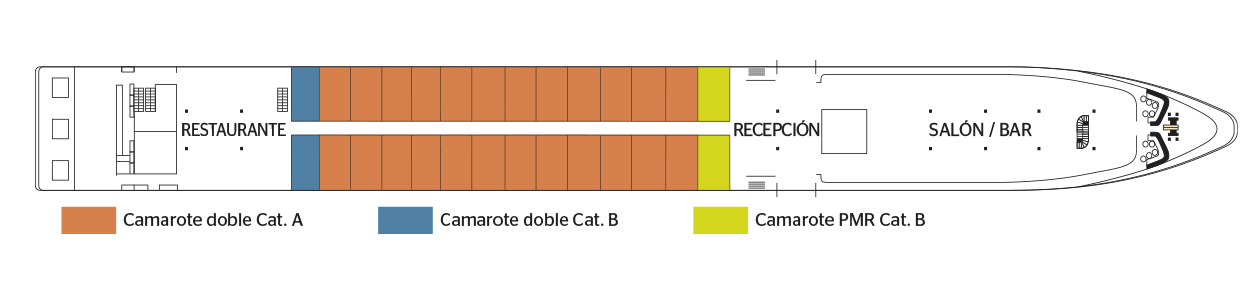 Camarote amplio y cómodo con dos camas individuales, acondicionada para personas con movilidad reducida, baño adaptado (lavabo, ducha y aseo privados, toallas incluidas), secador, televisión, caja fuerte y radio. Situado en el puente superior con ventanas correderas, ofrece una vista panorámica del paisaje.Áreas comunes del barco