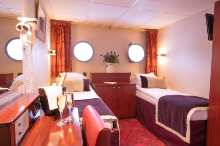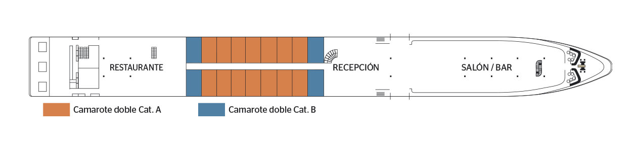 Camarote cómodo con dos camas individuales separados, baño (lavabo, ducha y aseo privados, toallas incluidas), secador, televisión, caja fuerte y radio. Situado en el puente superior con ventanas altas correderas, ofrece una vista panorámica del paisaje.Áreas comunes del barco
