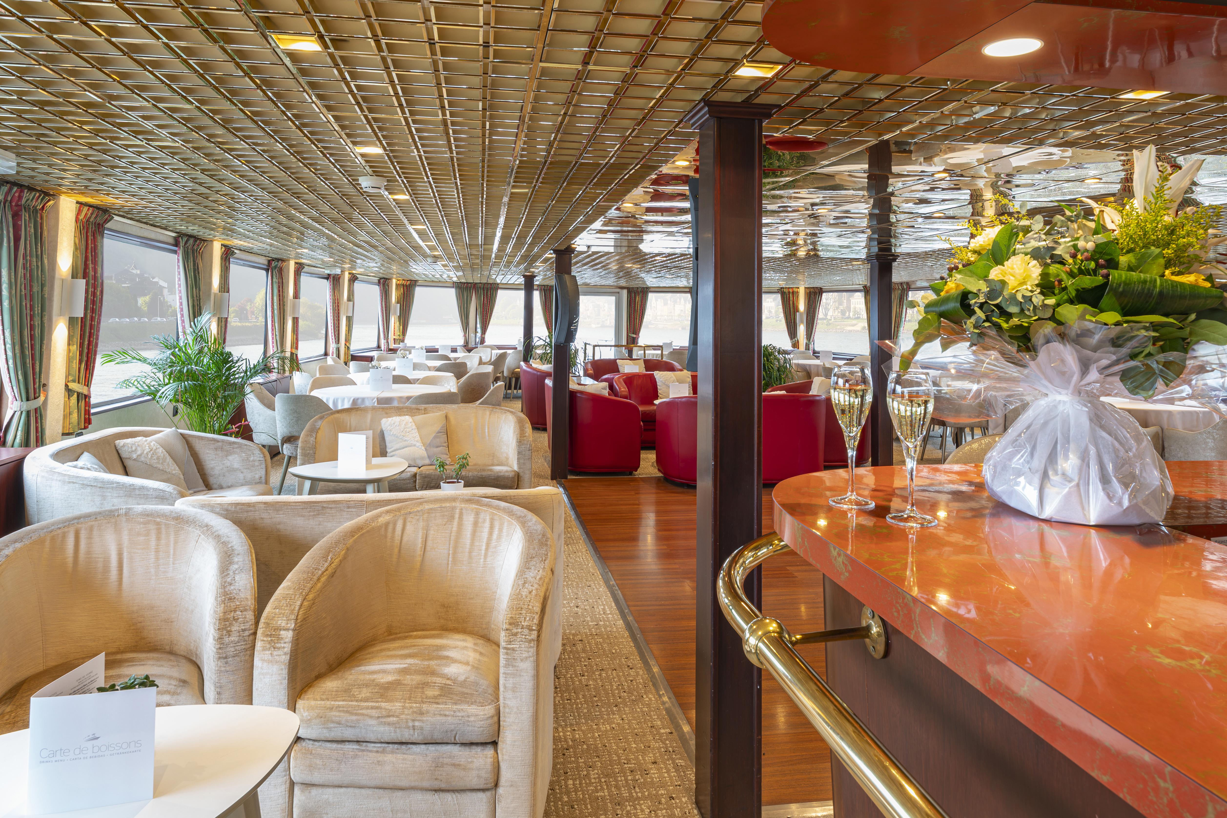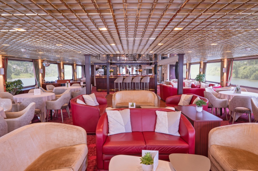 La decoración en tonos crema y burdeos es a la vez delicada y acogedora y rinde homenaje a la obra más célebre de Leonardo da Vinci, la Gioconda. En el puente superior, el restaurante donde se sirven todas las comidas durante el viaje, propone una cocina delicada en un entorno refinado donde los grandes ventanales permiten disfrutar de hermosas vistas. En este mismo puente se encuentra el salón / bar con pista de baile, mientras que en el puente Sol, lugar ideal para relajarse y admirar los paisajes, los pasajeros pueden disponer de confortables tumbonas además de un gran espacio sombreado.