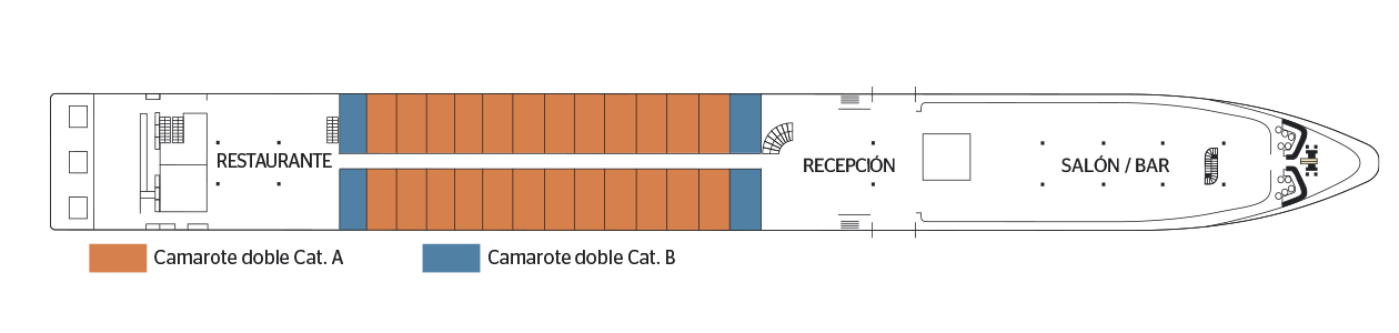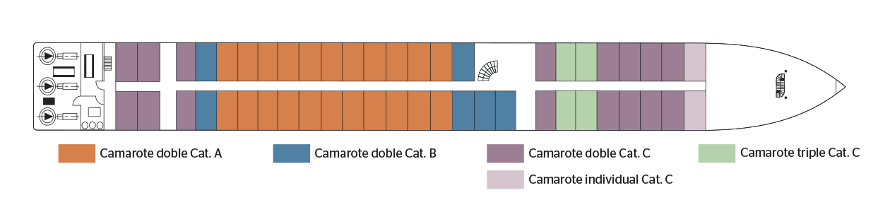 Camarote amplio y cómodo con capacidad para 3 personas (2 camas inferiores y 1 superior), baño (lavabo, ducha y aseo privados, toallas incluidas), secador, televisión, caja fuerte y radio. Situado en el puente principal con grandes ventanas, ofrece una vista panorámica del paisaje.PUENTE SUPERIOR
