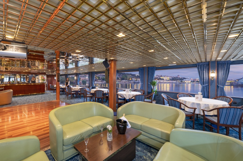 Ubicado en el puente superior, el restaurante, en el que se sirven todas las comidas durante el viaje, ofrece una cocina delicada en un ambiente refinado, donde grandes ventanales permiten disfrutar plenamente de las vistas. En este mismo nivel se encuentra el salón / bar con pista de baile, mientras que en el puente sol, lugar ideal para relajarse y disfrutar de los paisajes desde su gran área sombreada, los pasajeros pueden hacer uso de cómodas tumbonas.