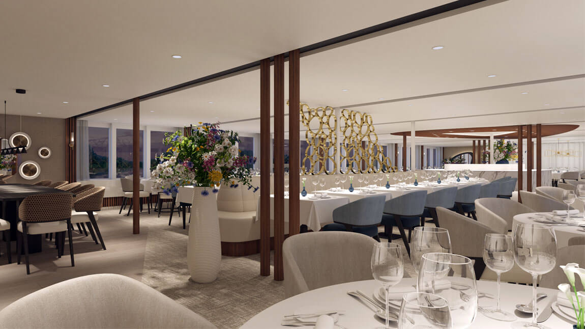 La zona de restaurante se sitúa en la cubierta intermedia donde los pasajeros pueden disfrutar de un ambiente refinado y de vistas excepcionales mientras saborean platos regionales e internacionales. El salón panorámico, ubicado en la parte superior del barco, es un lugar ideal para relajarse, socializar y disfrutar de las vistas del río.