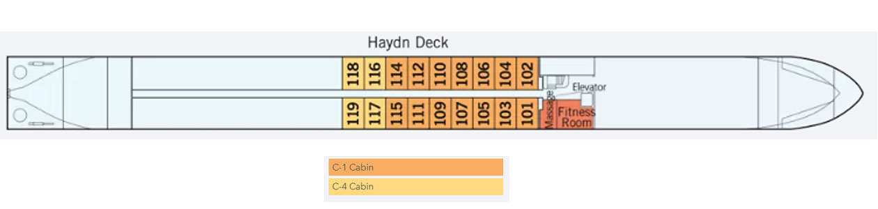 Camarote doble con baño espacioso, pequeña ventana panorámica (no se puede abrir), armario espacioso, elección de la configuración de la cama (cama doble o dos camas individuales), televisor de pantalla plana, control de temperatura individual, baño en suite con ducha / WC, secador de pelo, teléfono de marcación directa y caja fuerte en la habitación. Las cabinas con puertas comunicantes están disponibles bajo pedido.Cabina C4 Puente Inferior