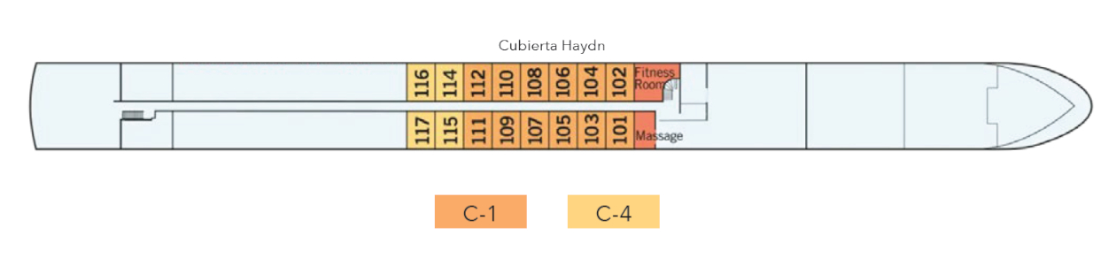El camarote cuenta con un amplio cuarto de baño con ducha a ras de suelo, lujosos productos de baño Rituals y secador de pelo, además de una ventana panorámica fija que llena el espacio de luz natural. Detalles cuidadosamente pensados, como una cómoda cama doble o dos camas individuales, un armario de generosas dimensiones, caja fuerte en la habitación, televisión de pantalla plana, control individual de la climatización y teléfono de marcación directa, garantizan una estancia tranquila y bien equipada.16