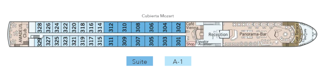 Esta cabina cuentan con la cama exclusiva AMADEUS (disponible en versión doble o con dos camas individuales), una ventana panorámica abatible para disfrutar de vistas ininterrumpidas al río, un amplio cuarto de baño con ducha a ras de suelo y productos de baño Rituals® de primera calidad, vestidor, televisión de pantalla plana, control de temperatura individual, minibar bien surtido, caja fuerte en la habitación, albornoz y zapatillas, secador de pelo y teléfono de marcación directa, lo que garantiza una experiencia de viaje cómoda y refinada.17