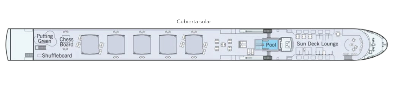 - Cubierta solar con “Lido- Bar”, tumbonas, toldos de sombra, minigolf, tablero de ajedrez gigante y pista de shuffleboard.