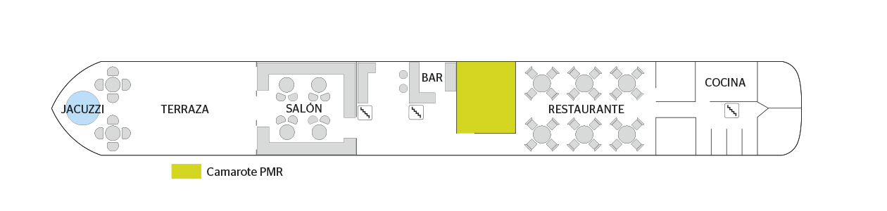 Camarote cómodo con cama grande, acondicionada para personas con movilidad reducida, baño adaptado (lavabo, ducha y aseo privados, toallas incluidas), secador, televisión, caja fuerte y radio. Situado en el puente superior con ventanas altas, ofrece una vista panorámica del paisaje.Áreas comunes del barco
