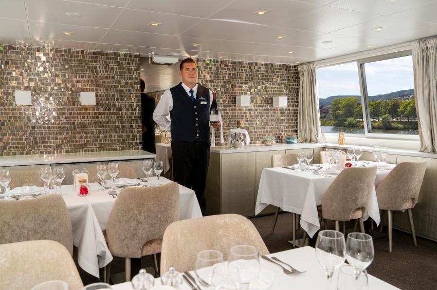 Ubicado a nivel del puente superior, el restaurante, donde se sirven todas las comidas durante el viaje, propone una cocina delicada en un ambiente refinado.