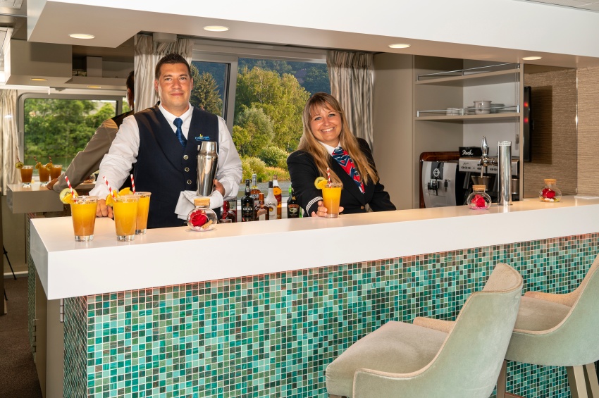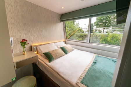 Camarote amplio y cómodo con cama grande, acondicionada para personas con movilidad reducida, baño (lavabo, ducha y aseo privados, toallas incluidas), secador, televisión, caja fuerte y radio. Situado en el puente superior con ventanas altas, ofrece una vista panorámica del paisaje.Áreas comunes del barco