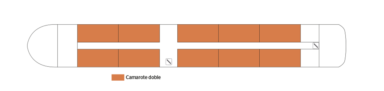 Camarote amplio y cómodo con cama grande, acondicionada para personas con movilidad reducida, baño (lavabo, ducha y aseo privados, toallas incluidas), secador, televisión, caja fuerte y radio. Situado en el puente superior con ventanas altas, ofrece una vista panorámica del paisaje.Áreas comunes del barco