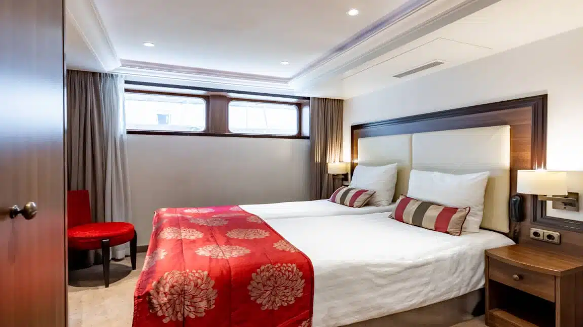 Este barco dispone de 76 habitaciones exteriores y elegantemente decoradas repartidas en tres cubiertas. Todas ellas con aire acondicionado y televisor de pantalla plana. El baño privado con ducha está provisto de artículos de higiene personal y secador de pelo. Entre las comodidades, se incluyen caja fuerte y escritorio, además de un servicio de limpieza disponible todos los días.