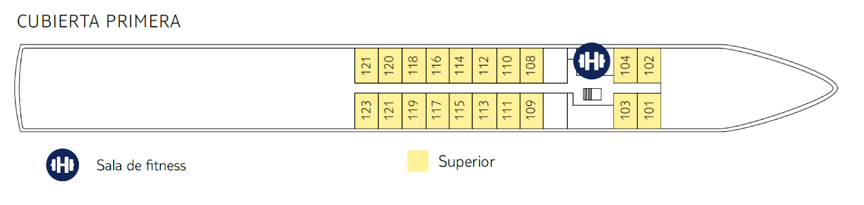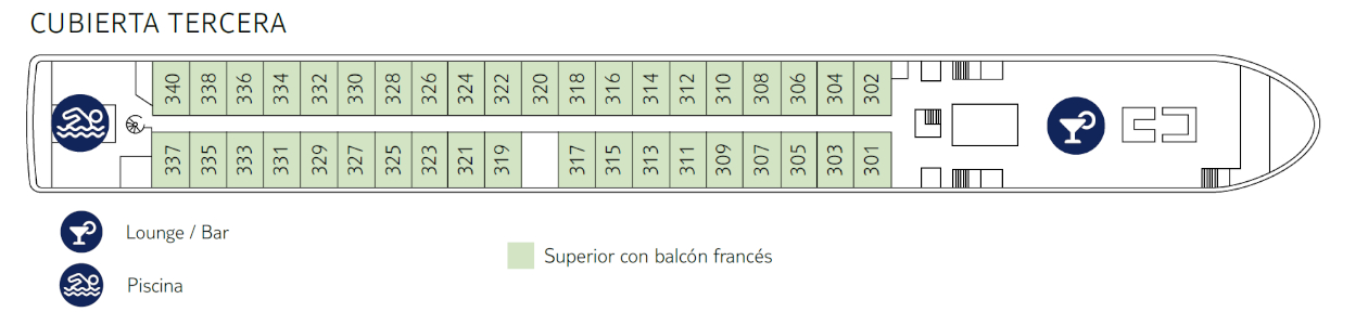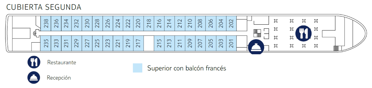 Además, el barco cuenta con camarotes de ocupación doble y camarotes individuales. Los camarotes tendrán ventana o balcón francés, para disfrutar de las vistas durante la navegación. Cuentan con escritorio y un sillón, además de una cama doble convertible en dos camas individuales. También incluyen todo lo esencial, como cafetera y tetera, aire acondicionado, secador de pelo, televisor de pantalla plana y caja fuerte.