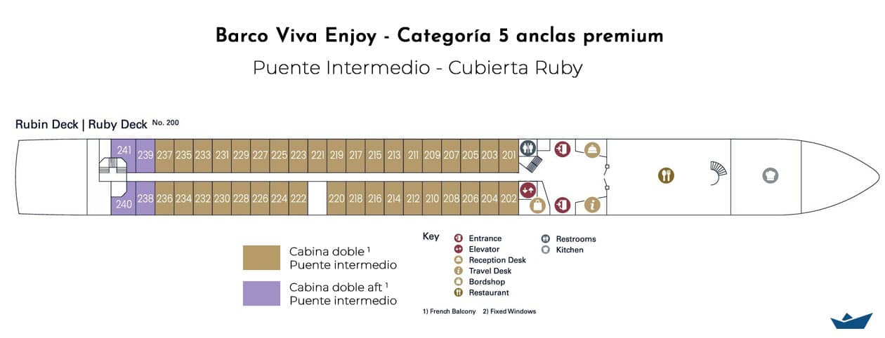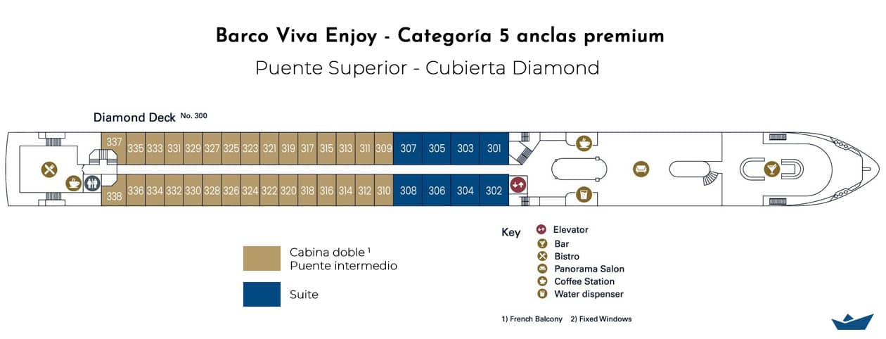 El MS VIVA ENJOY es el tercer barco de nueva construcción de VIVA Cruises y ofrece a bordo 95 camarotes con capacidad para 190 pasajeros.