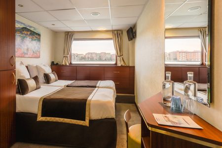 Camarote amplio y cómodo con cama grande separable, baño (lavabo, ducha y aseo privados, toallas incluidas), secador, televisión, caja fuerte y radio. Situado en el puente principal con ventanas, ofrece una vista panorámica del paisaje.