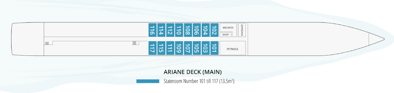 Dispone además, de un gimnasio y una sala de masajes en la cubierta Ariane (Puente Inferior). Ofrece el salón con 4 televisores y 1 proyector en el salón, para el uso gratuito de posibles presentaciones, etc.