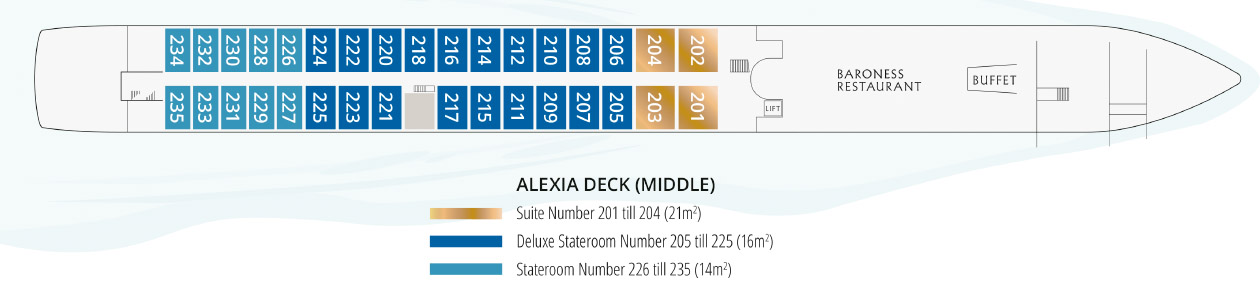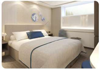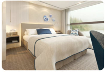 Cabina de 16m² confortable y elegantemente decorada. Cuenta con una ventana panorámica, minibar y botellas de agua, secador de pelo, luz en el armario, televisión de 40 pulgadas y teléfono para contactar con recepción. Cuenta con dos camas de 90 cm que se pueden separar.Áreas comunes del barco