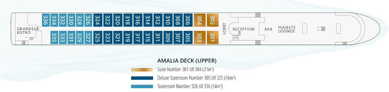Cabina de 16m² confortable y elegantemente decorada. Cuenta con una ventana panorámica, minibar y botellas de agua, secador de pelo, luz en el armario, televisión de 40 pulgadas y teléfono para contactar con recepción. Cuenta con dos camas de 90 cm que se pueden separar.Puente Superior - Amalia Deck