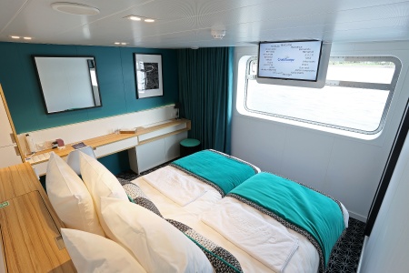 Camarote amplio y cómodo con cama grande separable, baño (lavabo, ducha y aseo privados, toallas incluidas), secador, televisión, caja fuerte y radio. Situado en el puente principal con ventanas de apertura superior, ofrece una vista panorámica del paisaje.