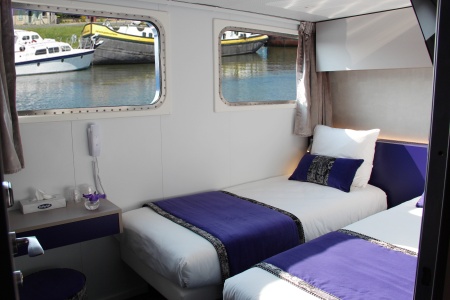Camarote amplio y cómodo con dos camas individuales, baño (lavabo, ducha y aseo privados, toallas incluidas), secador, televisión, caja fuerte y radio. Situado en el puente principal con ventanas altas, ofrece una vista panorámica del paisaje.