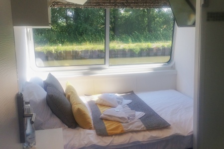 Camarote amplio y cómodo con cama grande, acondicionada para personas con movilidad reducida, baño adaptado (lavabo, ducha y aseo privados, toallas incluidas), secador, televisión, caja fuerte y radio. Situado en el puente superior con ventanas altas, ofrece una vista panorámica del paisaje.