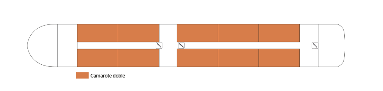 Camarote amplio y cómodo con cama grande, acondicionada para personas con movilidad reducida, baño (lavabo, ducha y aseo privados, toallas incluidas), secador, televisión, caja fuerte y radio. Situado en el puente superior con ventanas altas, ofrece una vista panorámica del paisaje.Áreas comunes del barco