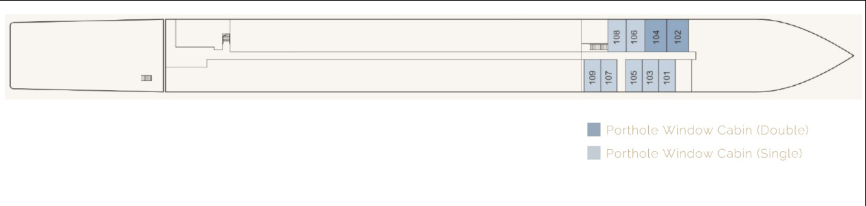 El barco cuenta con una capacidad reducida de pasajeros, en torno a 110–120 personas, lo que favorece un ambiente más íntimo y un servicio personalizado. Dispone de varias cubiertas que albergan tanto camarotes como zonas comunes. Entre las instalaciones destacan el restaurante panorámico, un salón lounge con bar, áreas de descanso interiores y exteriores, y una cubierta solárium equipada con tumbonas y espacios para disfrutar del paisaje durante la navegación.