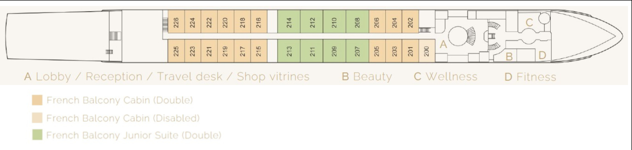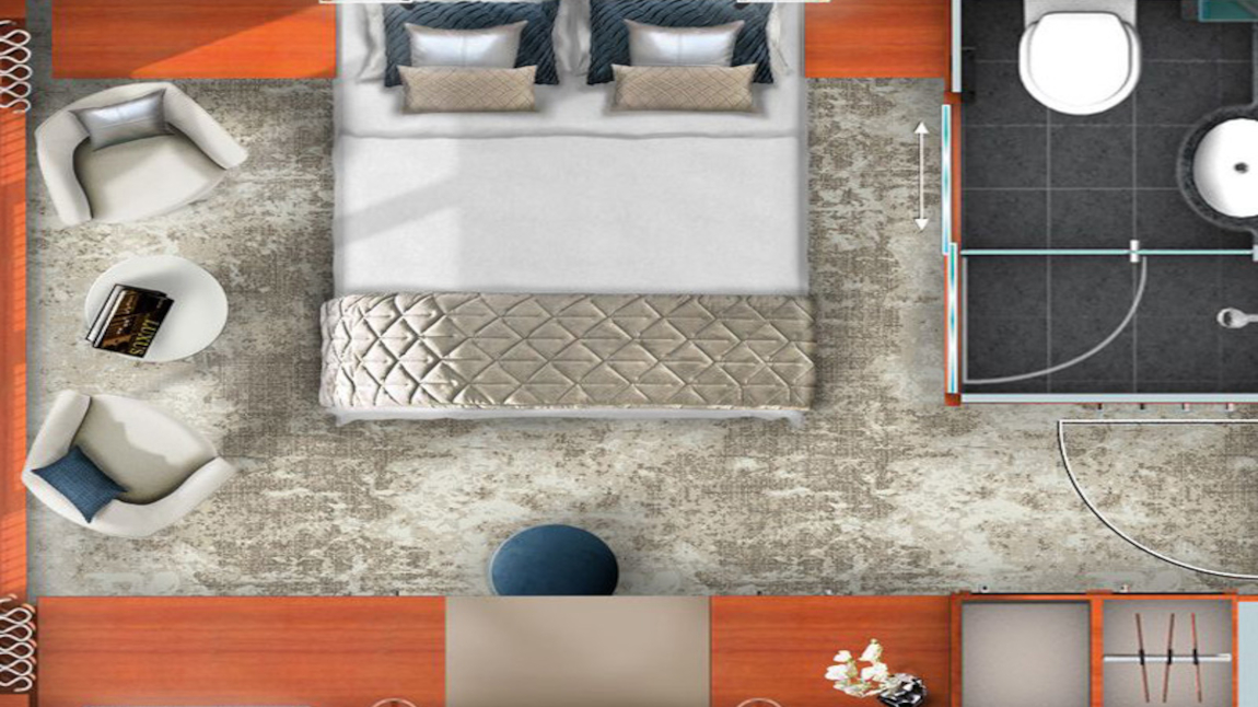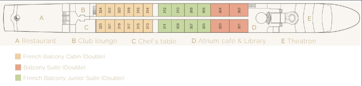 Camarote doble con una cama doble separable, un ventanal y un balcón francés panorámico de suelo a techo que se puede abrir. Tiene dos dos sillones y una mesita, escritorio/tocador, TV via satélite, aire acondicionado de regulación individual, teléfono, minibar, secador y caja fuerte. El baño privado tiene luz natural, una puerta corredera de vidrio, ducha y calefacción por suelo radiante.22