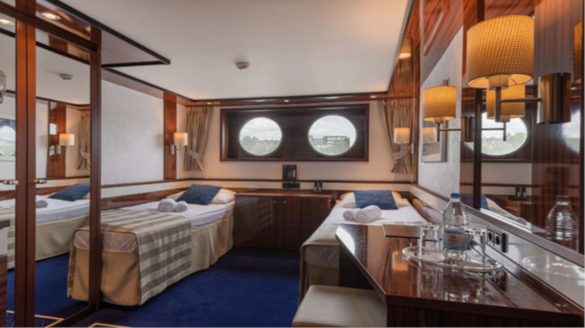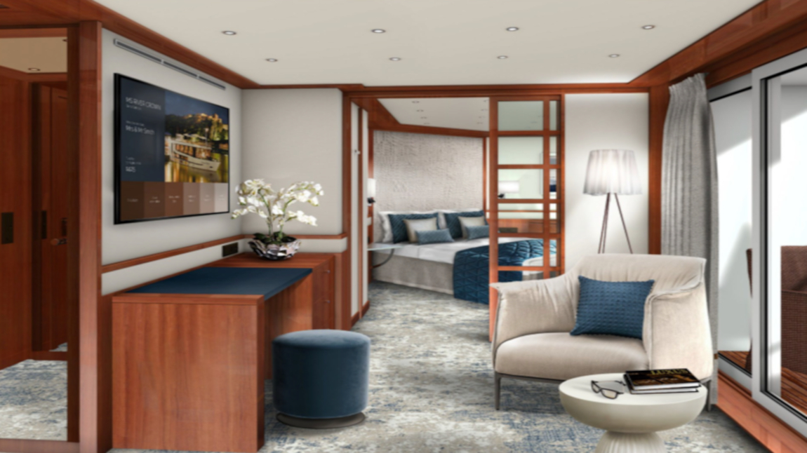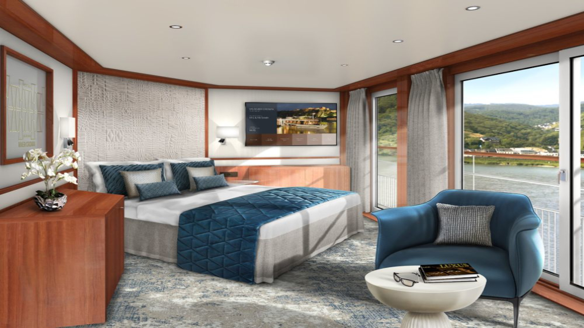 Los camarotes se distribuyen en distintas categorías, desde cabinas estándar hasta suites, muchas de ellas con balcón francés que permite la entrada de luz natural y aire fresco. Todos están diseñados con un estilo funcional y contemporáneo, ofreciendo baño privado, climatización y espacios de almacenamiento adecuados para viajes de varios días. En conjunto, el MS River Crown es un barco fluvial orientado a viajeros que buscan comodidad, buena organización de espacios y una experiencia relajada mientras recorren los ríos europeos.