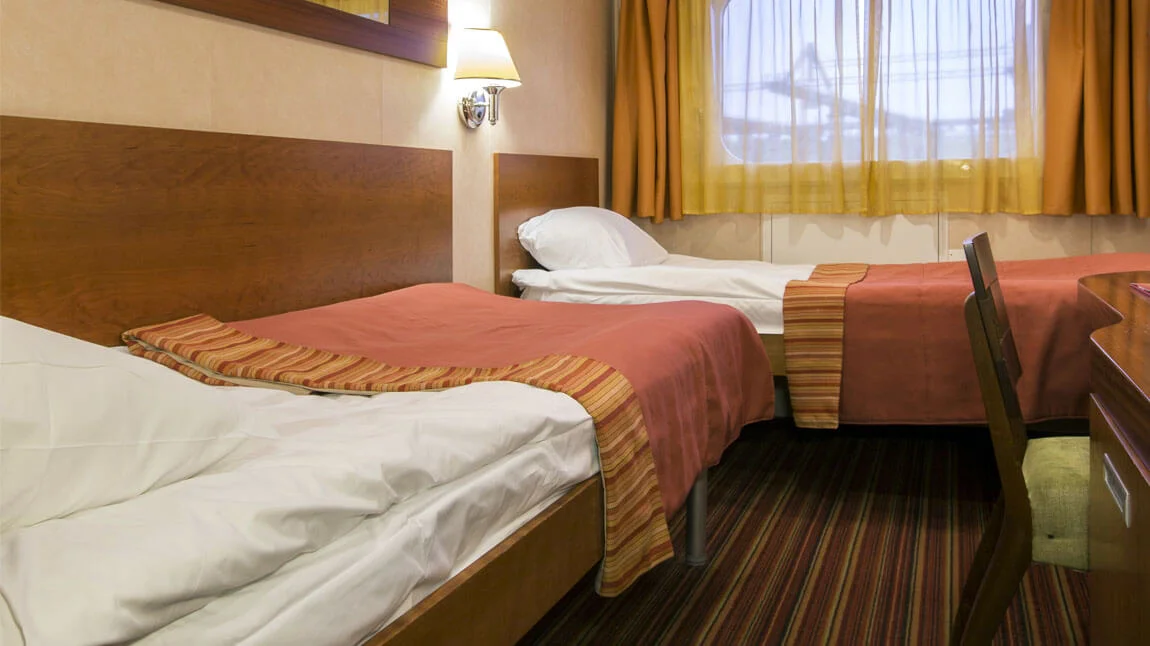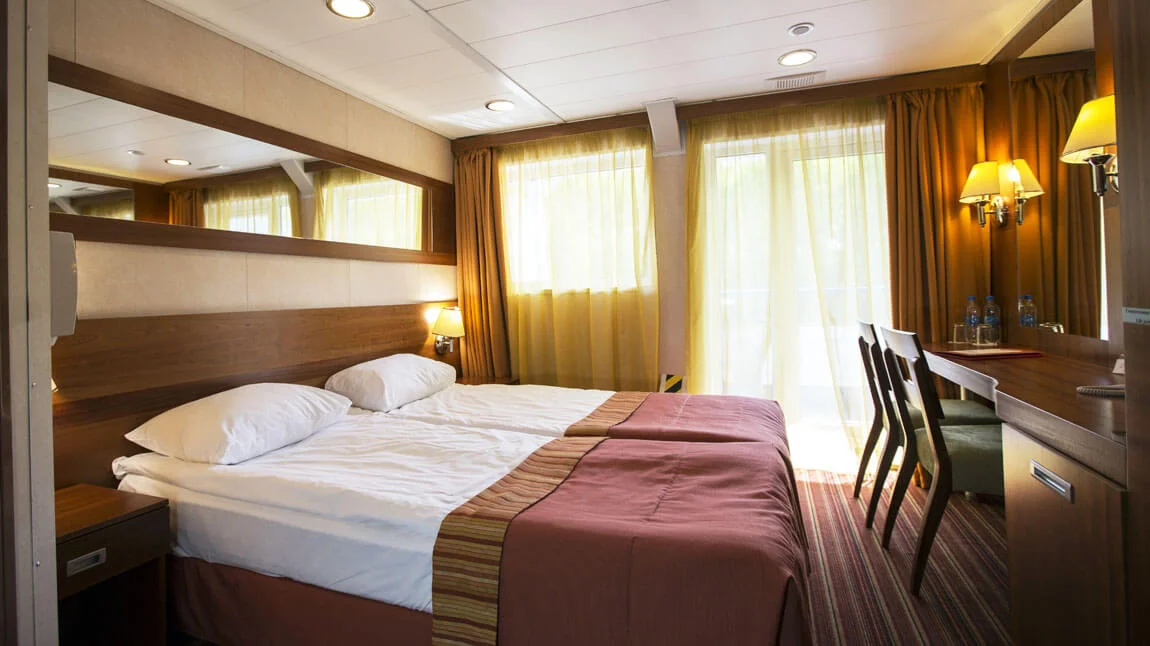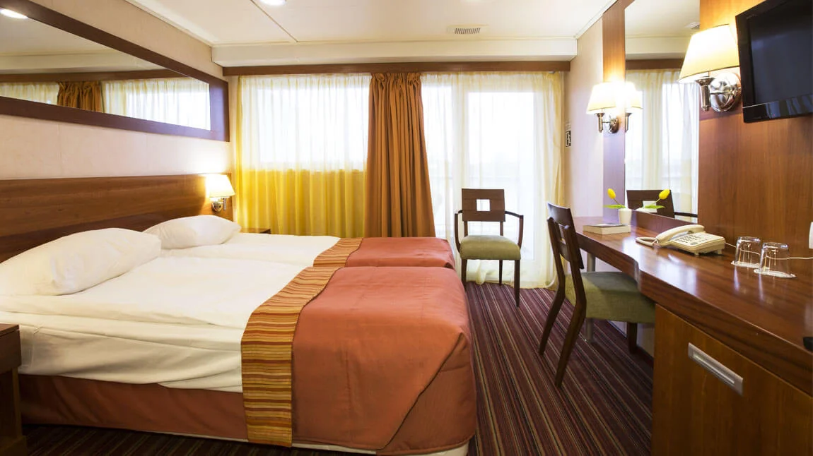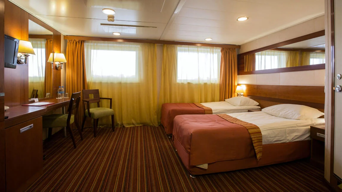 Camarote espacioso con dos camas individuales con ventana panorámica de gran apertura y baño con ducha.El camarote está decorado en estilo moderno y equipado con aire acondicionado, armario, mesitas de noche, consola con espejo, silla, enchufes de 220V, secador de pelo, caja fuerte, nevera, TV y radio.