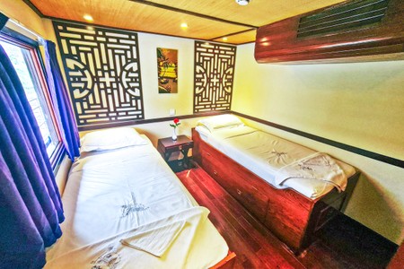 Barco de tamaño humano, el RV Toum Tiou II enlaza perfectamente la intimidad y el encanto. El revestimiento de madera exótica de las 14 cabinas le da un estilo antiguo con una atmósfera particular.