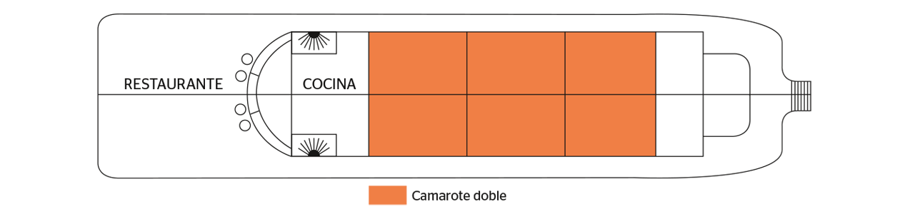 Cómoda cabaña con vistas a los paseos exteriores. Equipadas con dos camas separables, baño privado con ducha y productos de baño, zapatillas y albornoces en la habitación, armario y espacio de almacenamiento bajo la cama, aire acondicionado, miniconfort eléctrico, enchufes multiconfiguración y secador de pelo. Situado en la cubierta superior, con grandes ventanas panorámicas, lo que le permite una visión clara del río.11.00