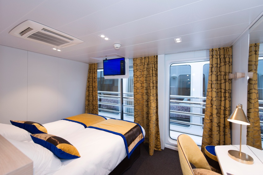 Suite amplia y cómoda con tres camas individuales, baño (lavabo, ducha y aseo privados, toallas incluidas), secador, televisión, caja fuerte y radio. Situada en el puente principal con balcón francés con ventanas panorámicas correderas, ofrece una vista panorámica del paisaje.Áreas comunes del barco