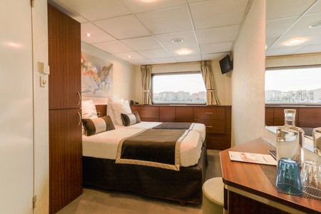 Camarote amplio y cómodo con cama grande separable, baño (lavabo, ducha y aseo privados, toallas incluidas), secador, televisión, caja fuerte y radio. Situado en el puente principal con ventanas, ofrece una vista panorámica del paisaje.