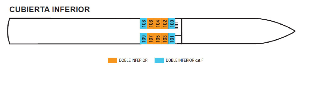 La cabina doble estándar inferior Cat. F en puente principal tiene un espacio compacto de unos 11 m2. Estas cabinas disponen de 2 camas que se guardan por la mañana para convertirlo en un cómodo sofá, una ventana pequeña alta, ducha y wc, televisión por satélite con un canal que muestra imágenes de la cámara instalada en la proa del barco, secador de pelo, caja fuerte, teléfono interno. Estos camarotes se corresponden a los camarotes Nº 100, 101, 108, 109, situados en zonas de paso y cerca de escaleras, son camarotes con mayor rumorosidad.Puente Intermedio