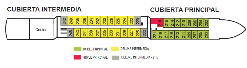 Las cabinas Deluxe Intermedio han sido recientemente remodeladas. Son cabinas espaciosas que disponen de 2 camas que se pueden juntar o separar para formar una de matrimonio. Estas cabinas tienen grandes ventanas que se pueden abrir, ducha y wc, televisión por satélite con un canal que muestra imágenes de la cámara instalada en la proa del barco, secador de pelo, caja fuerte, teléfono interno.Camarote Triple Principal